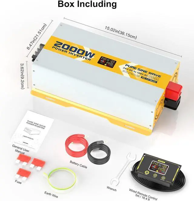 LED SCREEN & REMOTE CONTROLLER Icons on LED can directly show the running state of products quickly and accurately display abnormal problems. The rich accessory package allows you to use it freely. Inverter includes 2 120V GFCI AC output ports, 1 AC terminal board, 3 USB port 5V 2.4A, and 1 type-c port. Box contains 2 2.62 ft 3AWG positive and negative battery cable clips, a 1.64 ft ground wire, and 2 40A 32V fuses.
