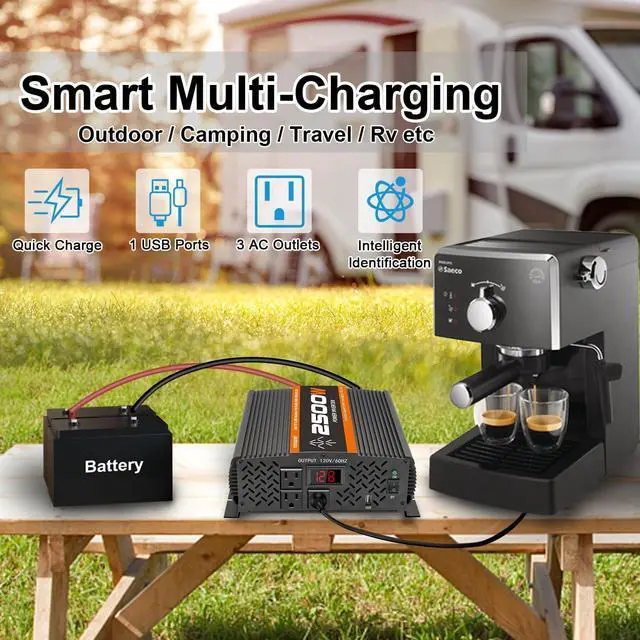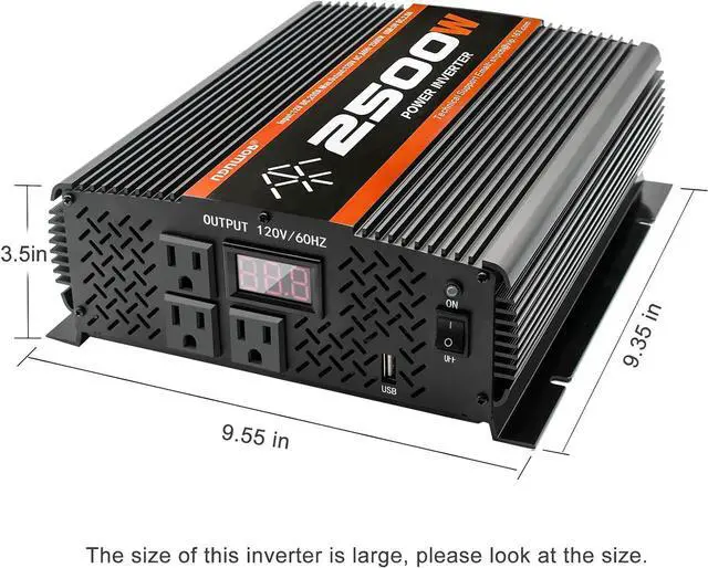 { 2500W Power inverter} This inverter converts 12V DC to 110V/120V AC and is a good home and outdoor emergency power supply with a continuous output of 2500 watts (5000 watts surge capacity). 3 AC sockets, 1 3.4A USB port, DC terminal