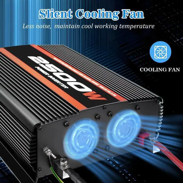 {Intelligent fan cooling} The 2500W modified wave inverter uses an intelligent fan system to dissipate heat during the entire operation. When the internal temperature of the machine reaches a certain level, the fan rotates to effectively reduce the temperature. {Multiple usage scenarios} You just need to connect the 2500W inverter to the 12V battery through a cable, and you can use 110V AC power anytime and anywhere. Ac appliances or devices for power outages, emergencies, hurricanes, holidays, cars, RVS, trucks, solar power, remote workplaces, or any place that requires AC power, such as TVS, ovens, floodlights, laptops, DVDS, players, cell phones, ipads, PSPS, cameras, etc. {More You Get}1x inverter 2500 watt + / inverter 2500W + 3 x Battery cables, 1x user manual, 12 months free Warranty, Inverter (L x W x H) size: 9.5 * 9.3 * 3.4 in, weight: 10.1 lbs