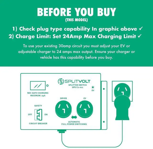 SAVE TIME & MONEY - Our NEW cETLus Certified Electric Vehicle Household Appliance power splitter. Instantly Provides Household Power for a Level 2 EV Charger. This home upgrade electrical switch allows you to share your dryer outlet with your car fast charger so saves you time and money!