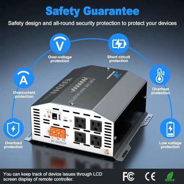 All-round Advance Protections: This 12V 1500W power inverter includes overload, over-voltage, under-voltage, over-temperature, and short-circuit protection. The built-in advanced dual intelligent cooling fans greatly reduce the machine's temperature, preventing overheating, minimizing noise, reducing battery consumption, and extending battery life.