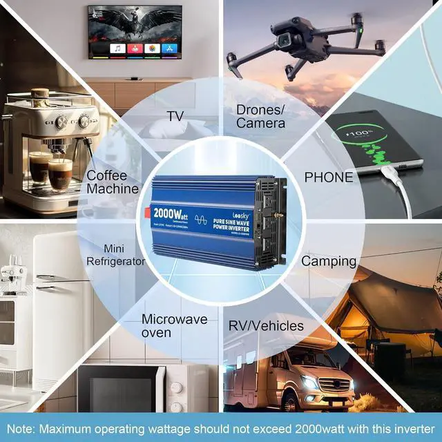 2000W pure sine wave performanceDelivers continuous 2000 W true sine power, effortlessly converting 12 V DC to stable 110120 V AC. Supports full output across 3×15 A AC outlets, and includes a 5 V 2.4 A USB port and heavy-duty 5 AWG battery cables.