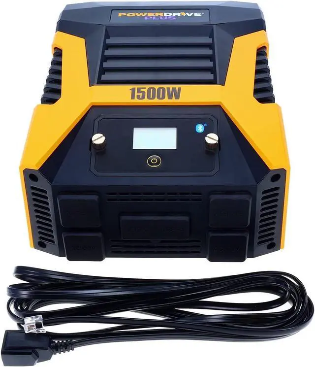 This 1500 Watt Power Inverter from has been upgraded to better suit your on-the-go lifestyle. Enjoy the conveniences of home while on road with Plus1500W high starting capability and max efficiency up 90 percent. (Surge power at 3000W) This wireless remote-control inverter connects all Android (R) iOS smartphones. The free Plus phone app lets you monitor update battery voltage or output product temperature. You can set protections such as under overload a distance. off using app. Design-savvy styling inverter's housing includes an illuminating glow reinforce that is active. durable ABS PVC composite tough rigid protect electronic components abrasion damage.