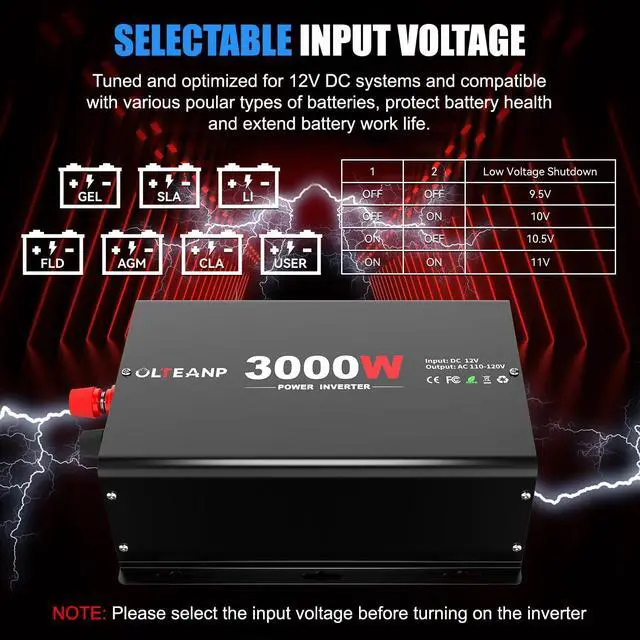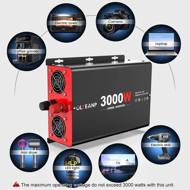 NEW UPGRADED POWERFUL 3000W CAR POWER INVERTER- The Power Inverter offers a continuous DC to AC power supply of 3000W, convert power from 12V to 110V, with a peak surge of 6000W during load startup. It employs advanced high-frequency transformers and features 100% pure copper ultra-flexible cables, ensuring a high level of safety during use.
