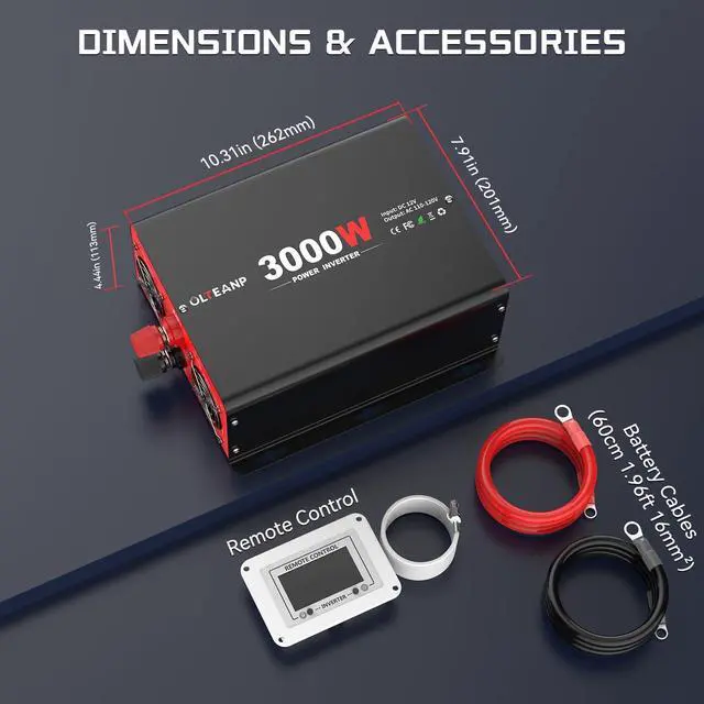 WHAT YOU WLL GET- 3000 watts 12V power inverter, battery cables, LCD screen remote controller, user manual. And 12 months professional customer service.