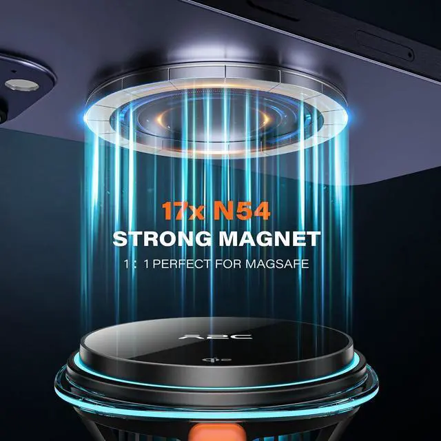 MagSafe: Equipped with 17 N54 magnets, this phone mount for car wireless charger delivers 20N of magnetic force for a secure, shake-free gripeven on bumpy roads. Compatible with iPhone 12/13/14/15/16/17 series (excluding iPhone 16e)