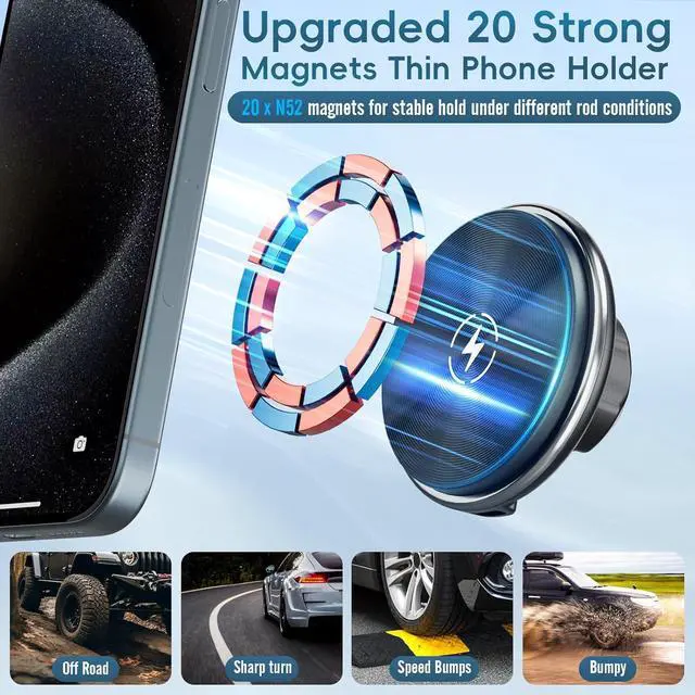 Super Strong Magnetic Force & Device ProtectionThe car phone magnet holder features 20 built-in magnets that provide exceptional suction power, keeping your phone securely in place even on the bumpiest roads or cobblestone streets. The enclosed magnetic field does not affect your phone signal whatsoever. With this cell phone car mount, you can easily use navigation and other functions