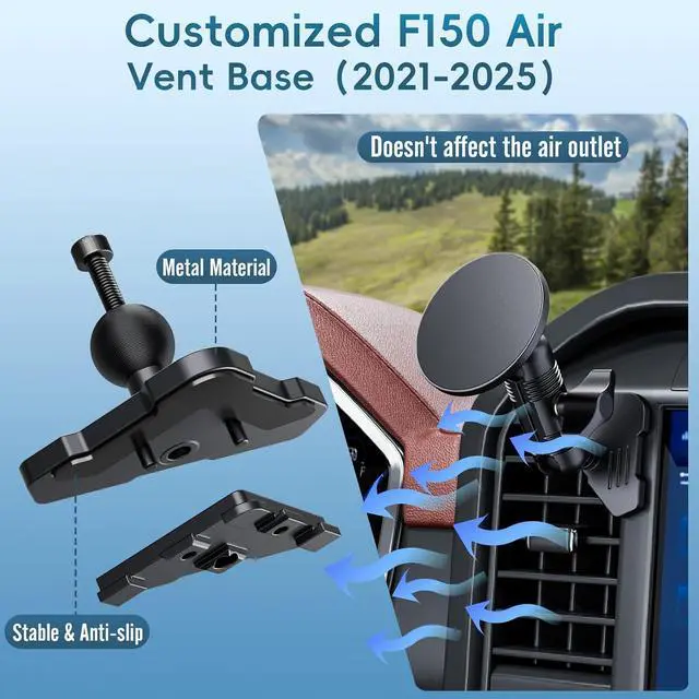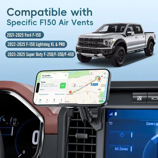 Exclusive CustomizationThe magnetic car phone mount is only designed for 2021-2025 FORD F-150 / Raptor (All Trims), 2023-2025 FORD SUPER DUTY (All Trims), 2022-2023 FORD LIGHTNING (Pro & XLT ONLY), and 2024-2025 FORD LIGHTNING (XLT ONLY). this magnetic air vent phone holder is only designed for OEM dashboard, not compatible with third party modifications