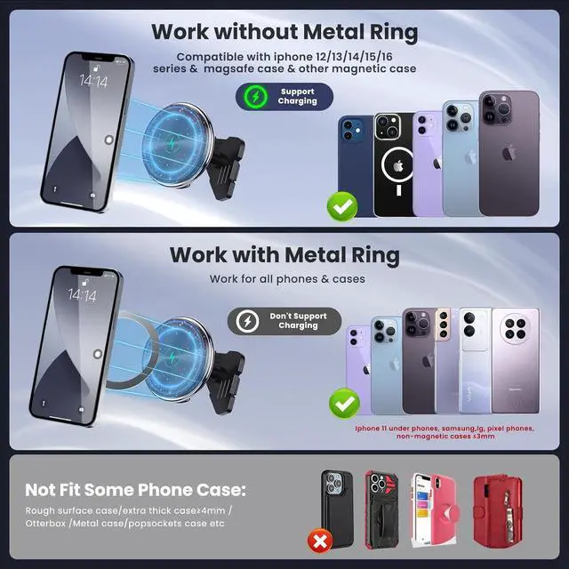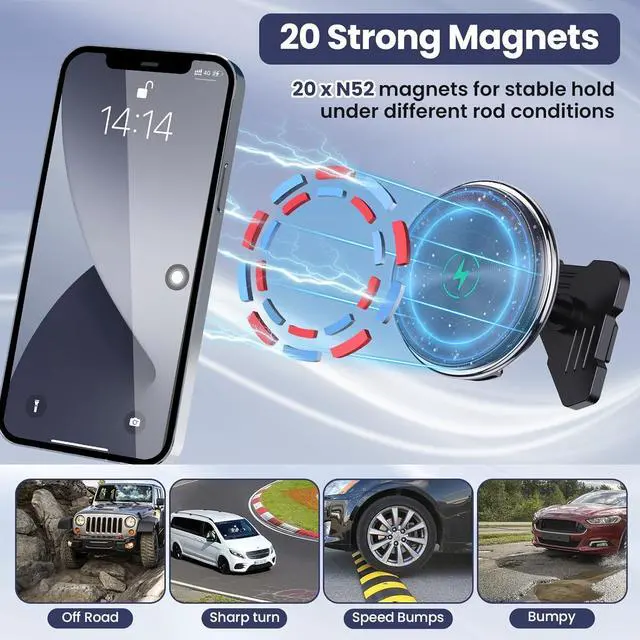 Super Strong Magnetic Force & Device ProtectionThe car phone magnet holder features 20 built-in magnets that provide exceptional suction power, keeping your phone securely in place even on the bumpiest roads or cobblestone streets. The enclosed magnetic field does not affect your phone signal whatsoever. With this cell phone car mount, you can easily use navigation and other functions