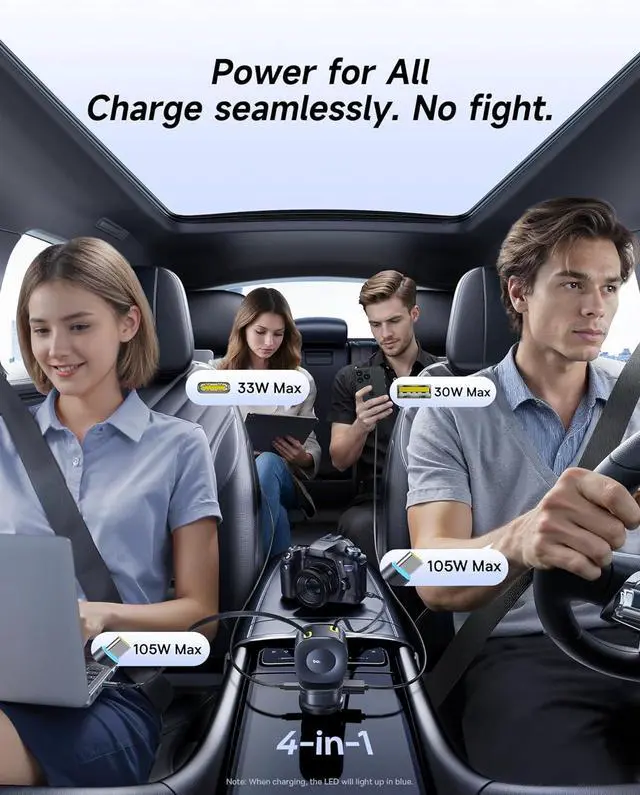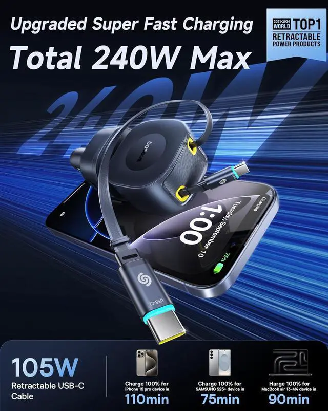 240W Max Retractable Car Charger: Experience lightning-fast charging for seamless office work on the go. Designed to support high-power devices such as laptops, tablets, and smartphones, this fast charging car charger ensures your road trips and daily commutes hassle-free. It includes a 105W USB-C1 cable output, a 105W USB-C2 cable output, a 33W USB-C3 port output and a 30W USB-A port output