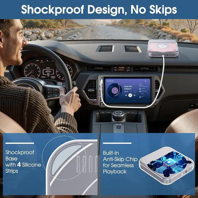 Anti-Shock for Smooth Driving Playback Designed for driving conditions, this portable cd player for car features advanced anti-skip chips that minimize playback interruptions caused by road bumps. The shock-absorbing internal system works together with four non-slip silicone pads on the bottom to keep the player stable and secure, ensuring smooth, skip-free music even on uneven roads.