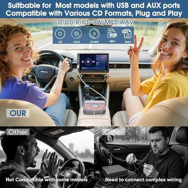 CD Player for Cars Without a Built-in CD Player This portable car CD player is designed for vehicles that lack a built-in CD system. No need to upgrade your car stereo, no FM pairing required, no complicated wiring, no extra adapter requiredjust plug and play to enjoy your favorite classic discs on the road.