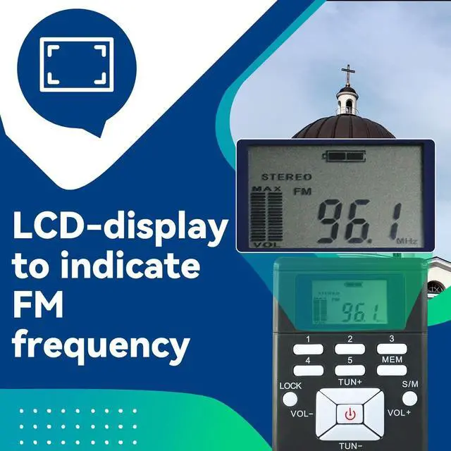Mini portable radio' LCD-display to indicate FM frequency; volume; battery indicator; 24 hour clock; 2 x AAA batteries not included