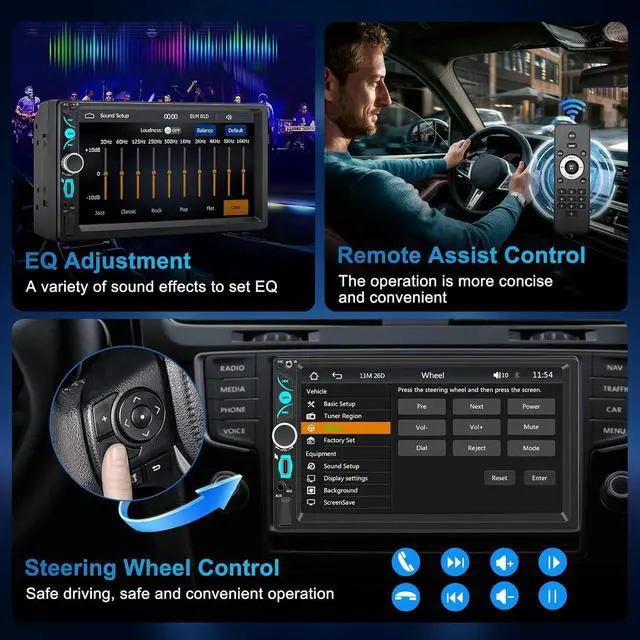 Effortless SWC ControlThis carplay double din system features integrated steering wheel controls (SWC), allowing you to control various functions directly from the steering wheel. Easily adjust the volume, change tracks and activate voice commands without taking your hands off the wheel, ensuring convenient and safe operation. Focus on driving and enjoy a seamless in-car entertainment experience.