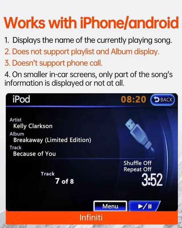 [BLUETOOTH MUSIC STREAMING FOR CAR] Bletooth adapter for Infiniti q50 g37 M37 qx70L qx50 fx35 qx60 USB connectors. Compatible for Infiniti q50 g37 M37 qx70L qx50 fx35 qx60 Music interface(USB port, not 30-pin ipod music interfere). Not compatible with Audi, BMW, Mercedes-Benz, Volkswagen, Land Rover, not compatible with cars that support carplay.