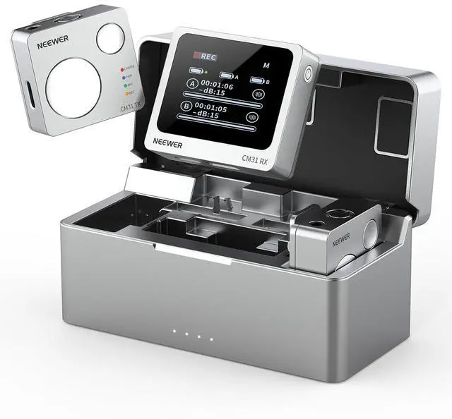Noise Cancellation/Mute/Db Gain This wireless microphone system also features one click noise cancelling for background noise reduction; three audio modes: M (mono), ST (stereo), and MS (safety track); and 15 gain control levels. Independently mute the TX on itself or use RX to simultaneously mute two TXs. Use the RX to adjust the output volume of both TXs for consistent sound quality. When working with two devices, it supports simultaneous audio monitoring, noise reduction, and mute
