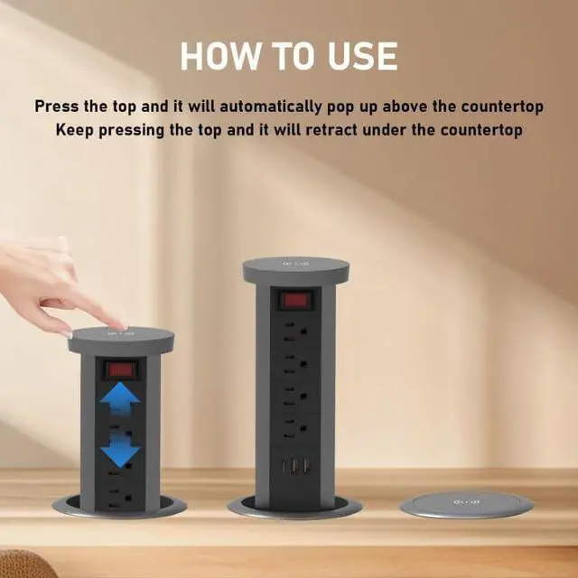 Comfortable life: Install it in the office or kitchen, pop it out when needed and retract it after use. Avoid clutter and create a simple and comfortable life. Package Contents: 1 X Pop up Outlet1 X instruction manual1X 6ft 14 AWG/3C Power cord.