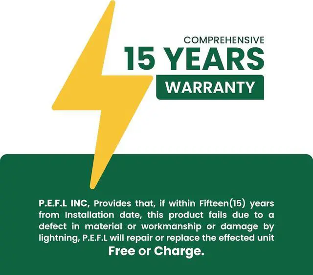 Warranty: Protects your home or office from electrical surges caused by lightning, power outages, and grid disturbances. Get a Fifteen (15) year comprehensive Warranty.