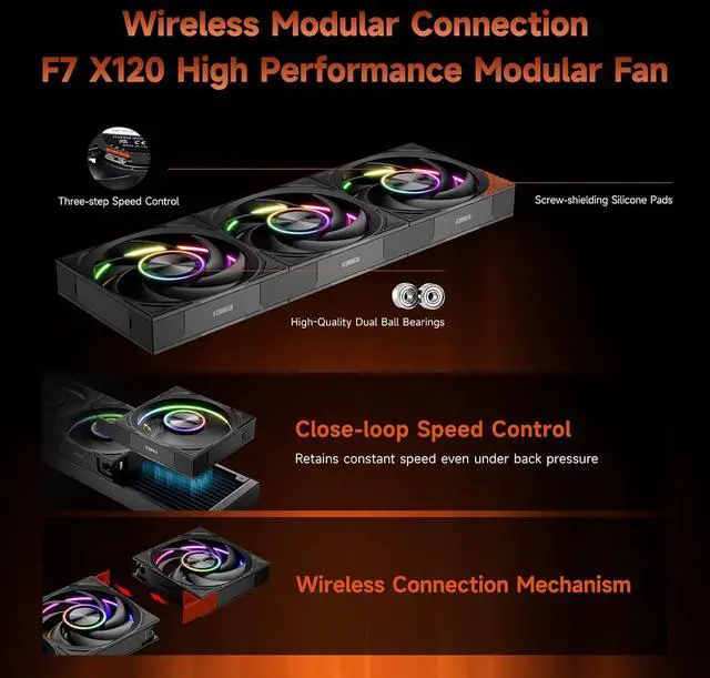 F7 X120 High-Performance Fans28mm thick design with superior airflow and static pressure, featu high-quality dual ball beas for quiet, reli operation.