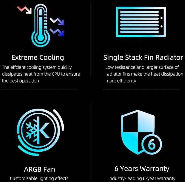 Diamond RGB Liquid CPU Cooler: 2x120mm ARGB fans help with heat dissipation and cool air to the radiator. Diamond Cut ARGB cap with fancy lighting effects synchronized with fans delive astonishing lighting. Compatible with most mainstream motherboard software to sync with the system