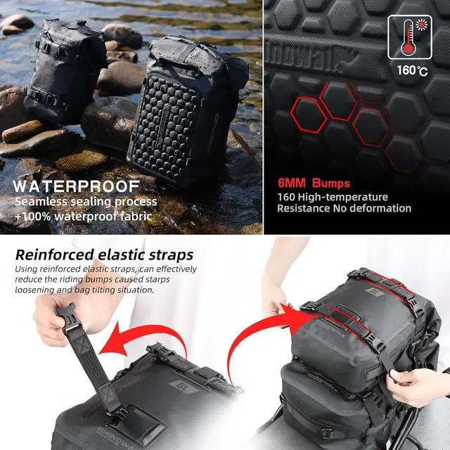 [Fully open and large storage capacity] meet the travel needs. Fully waterproof inner bag, no need to worry about riding in rain. 3D honeycomb cushioning, while increasing friction, making it more st and firm when riding.