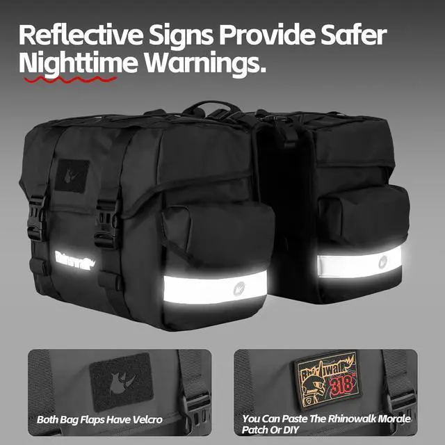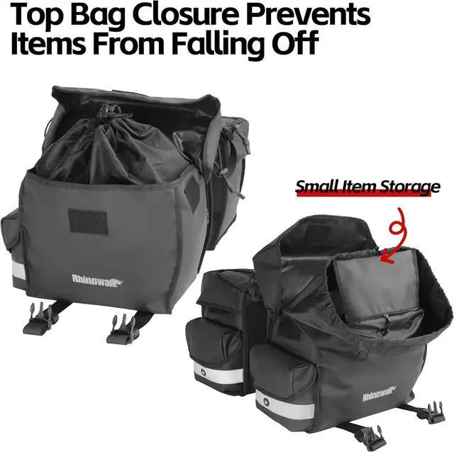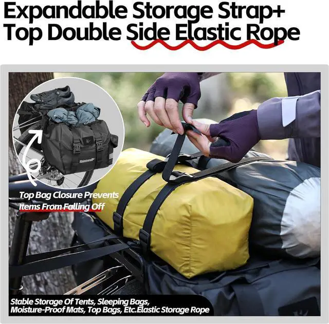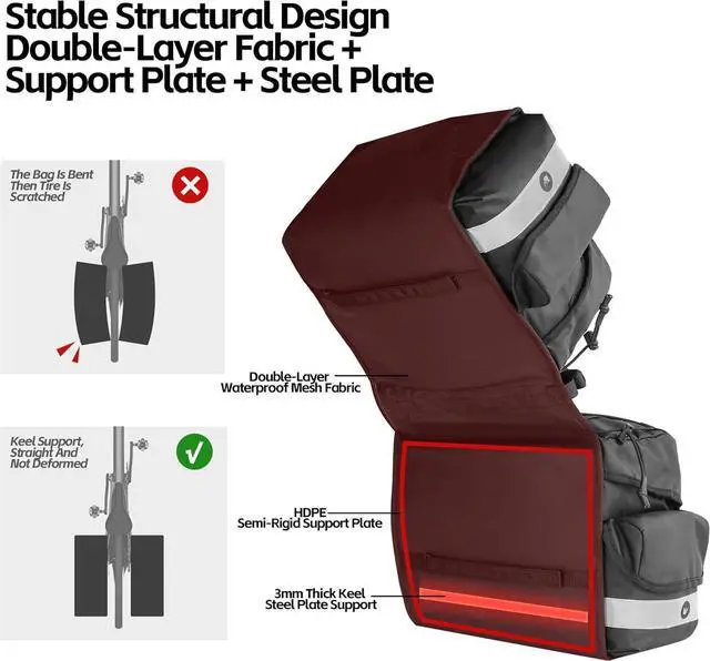 Four points fixation, more reli. This bag requires your rear rack to have at least four fixed points and support poles on two sides. Top adjust fixing straps fix on the rear seat, two side vro fixing straps fixed the the sides of the rack. The rear rack width needs to be 16cm. Installing 22L bag requires the rack length of 28cm, installing 40L bag requires the rack length of 32cm, and installing 50L bag requires the rack length of 34cm.