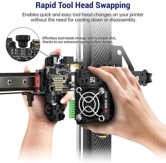 Easy to Disassemble: Round buckle structure, easy to press. Easy to install and disassemble. The Hermit Crab v2 makes replacing any hot end or tool so easy and won't come loose, safe and secure. Quickly replace the hot end with just one click, saving you tons of time. Various hot ends can be installed, such as nozzles, laser heads, CNC cutter heads, etc., to help realize multiple functions of the print head and replace various tool heads quickly and easily