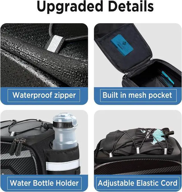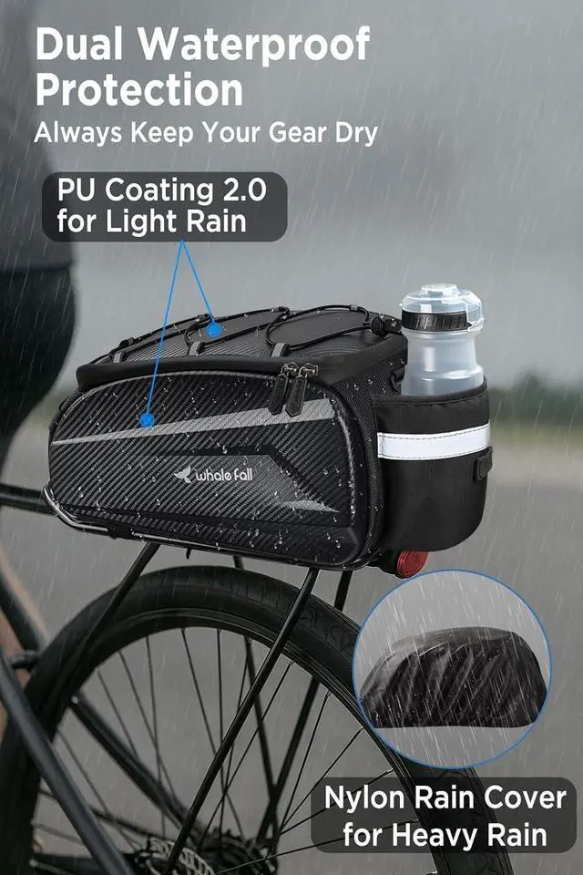 10L Spacious CapacityOur bike trunk bag offers a 10L storage capacity with two mesh inner pockets, an adjust elastic cord on top, and a bottle holder at the rear. It provides ample space for essentials like bike tools, pumps, wallets, phones, power banks, towels, clothes, food, drinks, and bike locks, making it perfect for long rides or daily commutes
