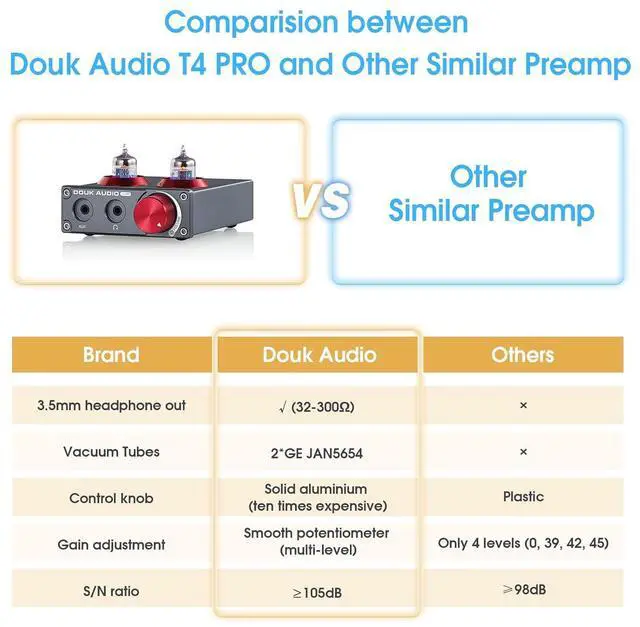Mini size and excellent performance: all designs full of details, solid alnum knob, potentiometer for smooth multi-ll gain adjustment, grey integrated moulding alnum alloy shell decorates with special red tube cover and knob, looks vintage and elegant. Compact T4 PRO will give you a different acoustic enjoyment with large dynamic and sweet tube sound n in limited space.