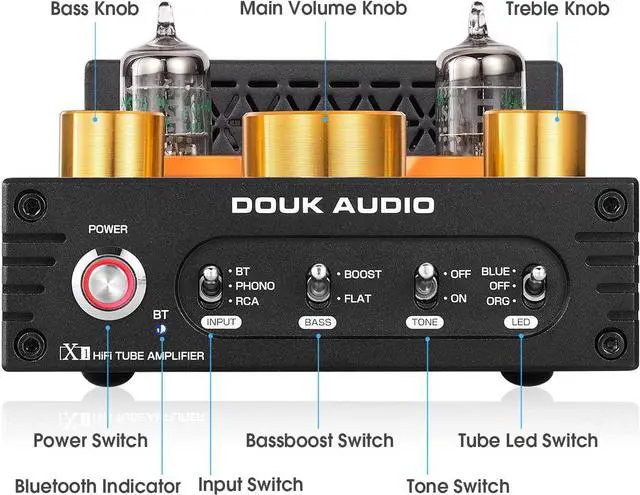 Exquisite Appearance & Proper Size: metal black case and vacuum tube with blue and orange decorating light looks fashion and attractive, designed input switch / bass and tone pass & bypass switch, very convenient to use and suit for stereo home and desktop audio system.
