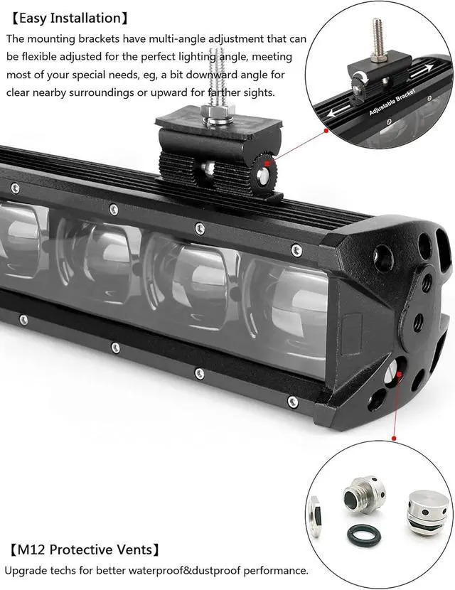 BETTER QUALITY: It works on low currents, but brightness is unabated. energy-saving, Led itself also benefit from a gentle run, Quick cooling alnum alloy heat sinks and high-quality heat conduction silicone gel can effectively extend the lifespan of the light bar to over 50, 000 hours. IP68 Waterproof Rate, waterproof up to 1 meter of water for 30 minutes and effectively dustproof. The stainless mounting brackets are rustproof and anticorrosive