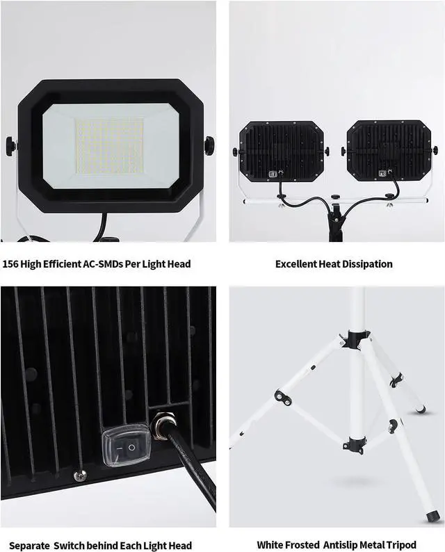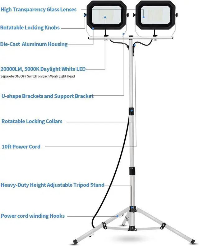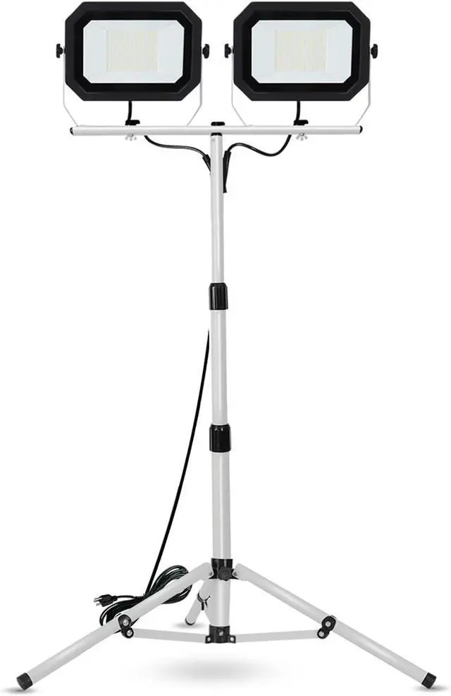 Height and Multi-direction Adjust - Convenient to quickly install, adjust work light without any tools, just rotate locking knobs or twist locking collars by hand. The telescopic tripod can be extended from 35 to 71 inches. Twin lamp heads can be rotated 360° horizontally and tilted 270° vertically. Exactly position and regulate illnation to your desired height, range and angle. work lights are extremely flexible and ideal for any project in various occasions