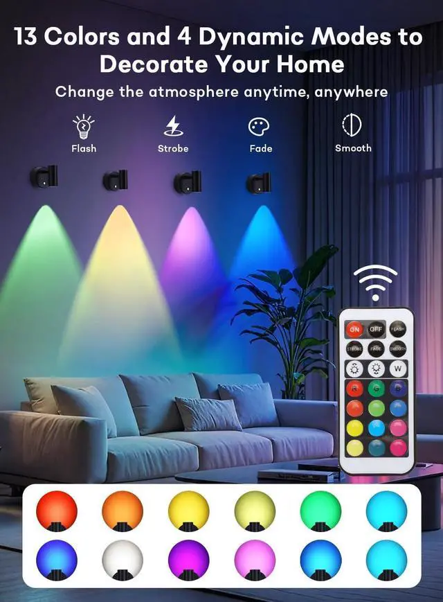 Remote & Touch ControlOur spotlight indoor offer both remote and touch control. With the remote control, you can easily control the color, brightness and effect of the light without leaving your couch or warm bed. If the remote control is not around, you can also easily customize your favorite lighting effects by touching the switch on the light, short press the switch to adjust the light color, long press the switch to adjust the light brightness.
