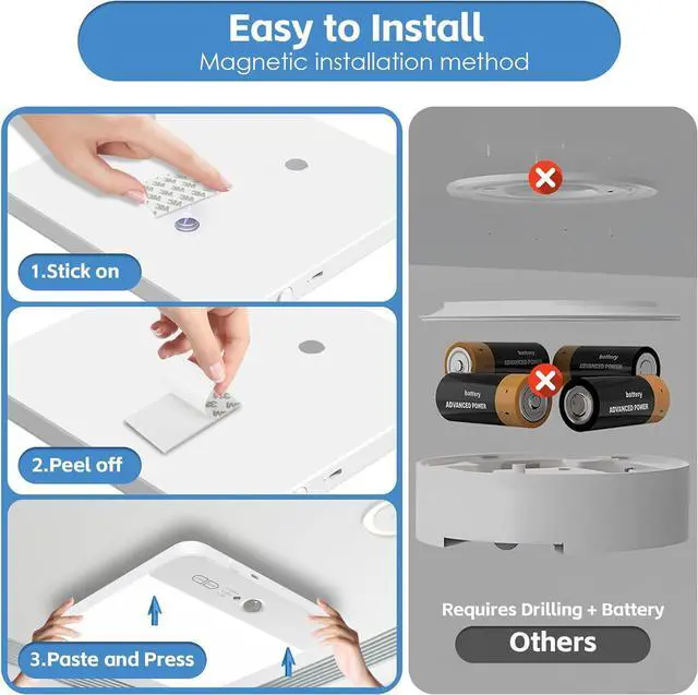 Wireless & Easy Installation: Wireless Ceiling Lamp with Remote is easy to install, just 3 steps can be installed in 1 minutes by yourself. Upgrade Magnetic suction+3M adhesive design, no need to drill holes to protect the wall