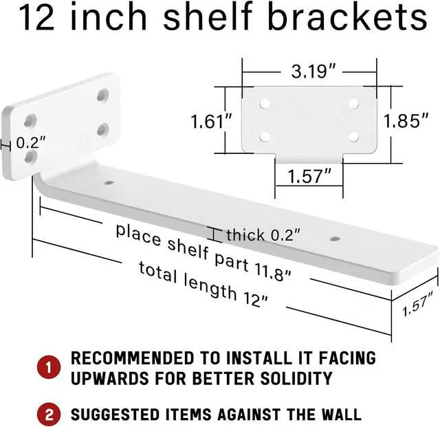 Unrestricted Space UsageWe provided 4, 6in, 8in, 10inch and 12inch brackets for floating shelves. Pick the right bracket or use it in combination depending on the actual space or the size of the planks. NoteThe size of the bracket to place the shelf p is 11.8" in length and 1.57" in wide. The brackets base is 1.85 * 3.19" with 0.2 thick. Please choose the appropriate size of the shelf, and the position of use.