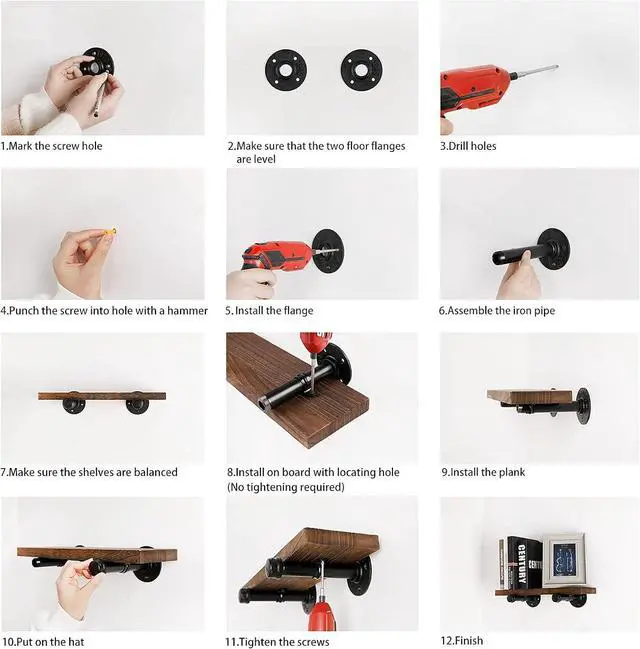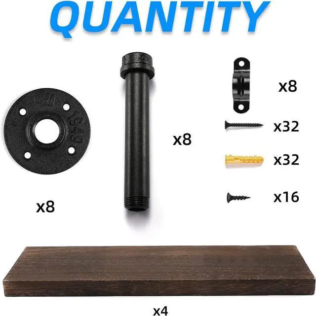 board x4 (size: 17" x 5.3" x 1"); flanges, caps, pipe, pipe straps x8; M 3.5 *16 black screw x16; M 3.5 *30 black screw x32; M04-42D wall plug x17; M6*30 wall plug x32. You can combine or install separately to place your items and save space
