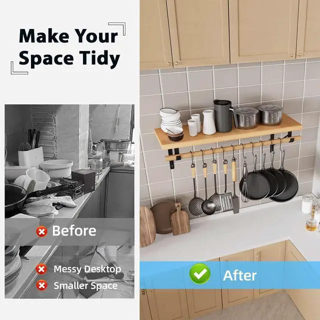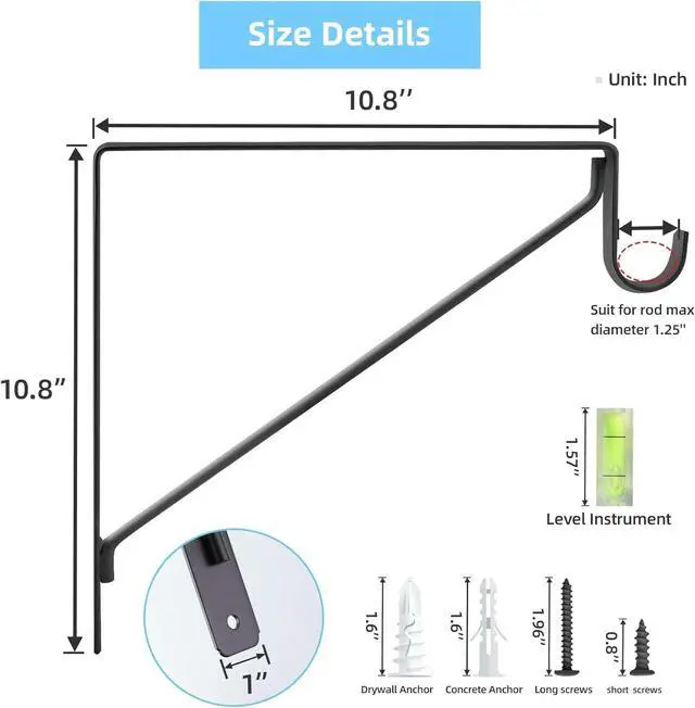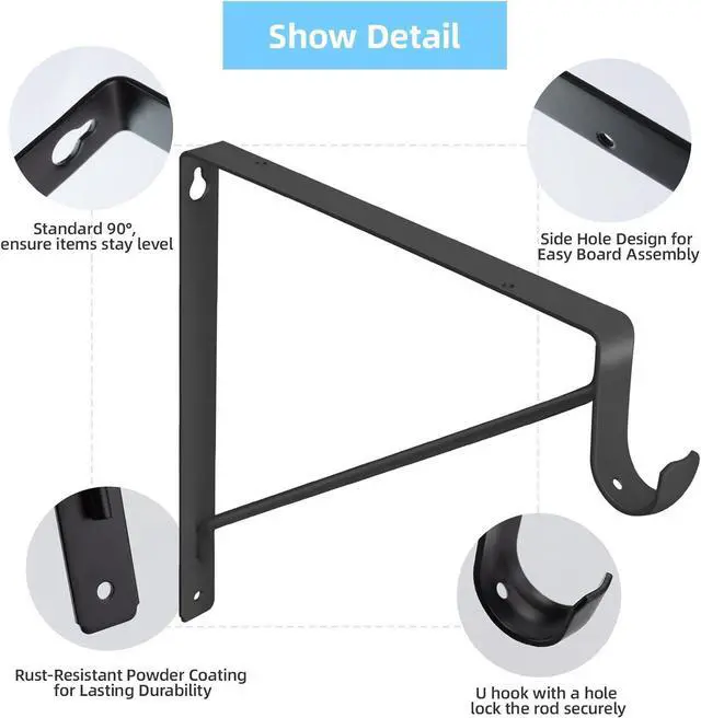 • Material and SizeMade of high-quality carbon steel material, the closet rod support measures 10.8''x10.8''x1'', thickness 0.1'' (2.5 mm), fit for rods up to 1.25'' in diameter, please confirm the shelf size is suit before purchase. The U-shaped design hook has a hole to lock the rod securely