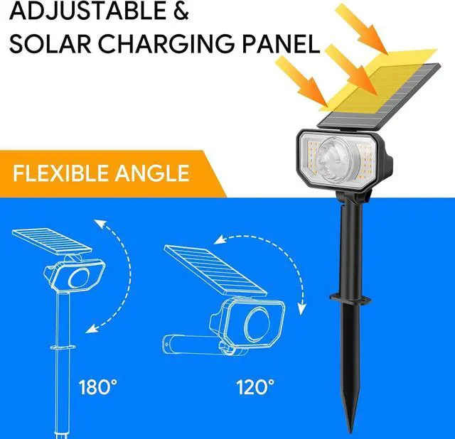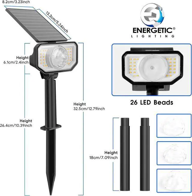 [Larger & Flexible Solar Panel]- The larger solar panels provide higher photoelectric conversion rate of up to 20%, greatly shortening the charging time. You could adjust the 120°solar panel & 180°rotat lighting head. Three height 12.6" / 18.9" / 25.3" can choose, perfect for patio, porch, pool, yard, garden, driveway, pathway, etc. The color solar spotlights are ideal for decorating your trees, gardens, flowers, walls, or your house in festivals or pies, etc.