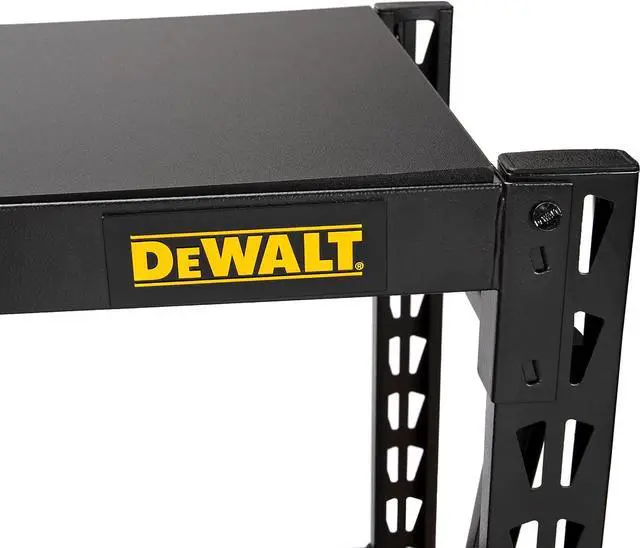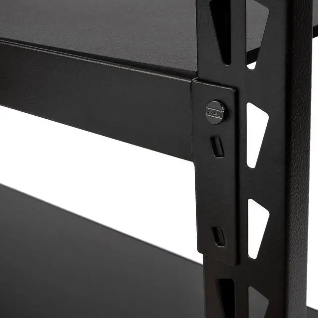 The DXST4500BLK 4-Foot Tall, 3 Shelf Industrial Rack was designed and engineered to provide heavy-duty, professional ll storage. industrial racks such as solid laminate decks, safety straps with weld nuts for ease of assembly, and top caps that protect both you and your items from possible damage. The three black laminate wood composite decks can each support an nly distributed 1, 500 lb. for a total of 4, 500 lb. The uprights, crossbeams, and support straps are all made from powder-coated steel and are designed so that once assembled, each shelf has two types of support straps in addition to the crossbeams to prnt them from buckling under pressure. The shelves are adjust in 2.35 -inch increments and the locking pins ensure that each shelf is properly installed. Glass-filled nylon feet on the uprights protect the powder coat from damage when repositioning the rack in addition to providing a second layer of protection against unwanted moisture and liquid spills while also protecting finished floo from damage. Each rack also includes 2 st plates so you can easily and securely join two racks together vertically or, thanks to the double row design of the uprights, connect them together horizontally to create a complete storage or workspace solution customized for your needs.