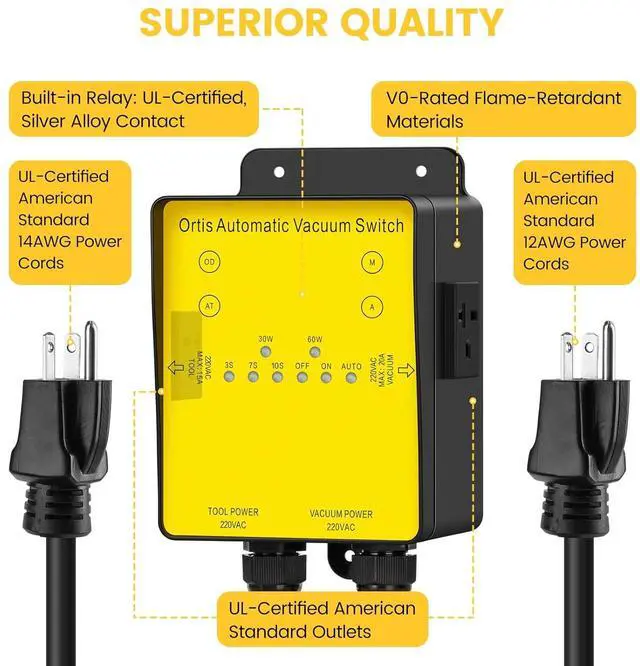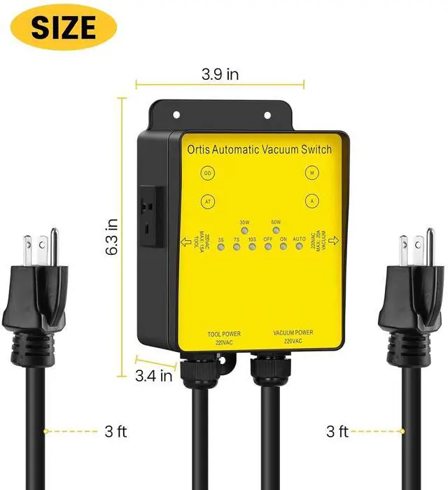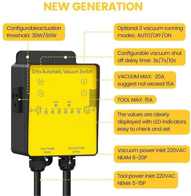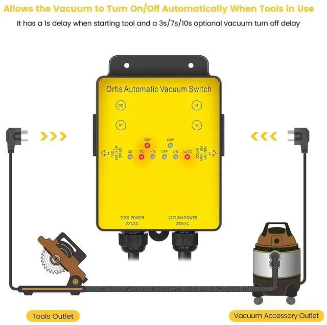 AUTOMATIC DELAY FEATURE & CONFIGUR TRIGGER THRESHOLDS: The vacuum switch features an automatic delay function that prnts circuit overload with a 1s vacuum delay time. It also offers optional configur vacuum delay times of 3s/7s/10s to continue air clearance while the motor spins down. Additionally, there are configur actuation threshold options (30W/60W) that en you to select the suit threshold according to your requirements. It's a must-have tool for woodworking