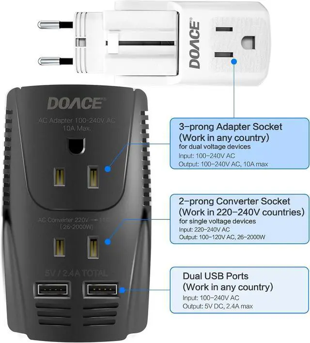Global Compatibility: Travel Adapter Converter is built-in with a US Plug and a all-in one travel plug adapter (UK, AU, EU, US). This adapter can be used with dual voltage devices under 2000W in all countries), allowing to be used in over 190 countries, such as Ukraine, Mexico, Thailand, Vietnam, Bali, Cambodia, Germany, Japan, China, Korea, India, Italy, Brazil, Europe, Asia, the Middle East, Etc.