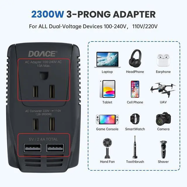 Note: Please note that the 2-prong AC converter socket can compatible with electric products are simple mechanical motors, but cannot work for too low wattage electronic devices(0-5W) such as electric shaver, electric toothbrush etc; The 3-prong adapter socket could not converter voltage, Do not insert 100V-125V devices into the adapter socket.
