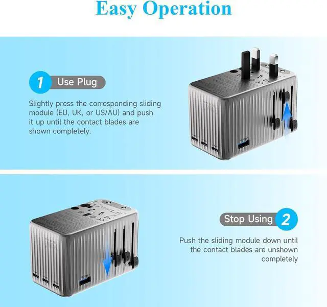 [Quality Assurance] Our travel adapter is certified by CE and FCC to ensure quality and safety. The high-quality shell material provides good heat dissipation and flame retardancy. After undergoing multiple tests, our power adapters are ensured to be easy to use, st and reli.