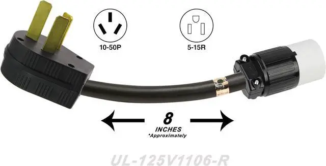 Plugs in to a NEMA 10-50R 50 Amp 240 Volt Receptacle Converts to 120 Volt 15-20 Amp connector without the need for a transformer. Allows you to connect a NEMA 5-15P 120 Volt 15 Amp standard electrical cord.