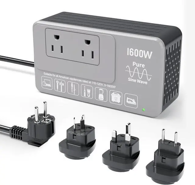 Easily convert 220250V to a st 120V pure sine waveideal for safely using U. S. appliances (110120V, up to 1600W) while traveling abroad. Comes with 4 international plug adapters for use in 160+ countries. Built-in advanced safety protections and sm fault detection ensure long-lasting reliability. No fuse replacement needed. Compact, powerful, and backed by a 2-year warranty.