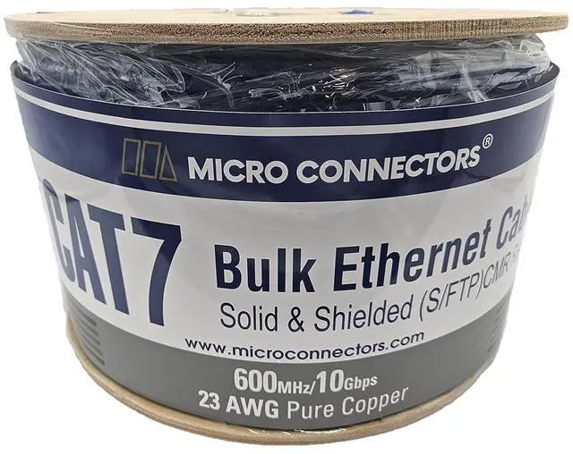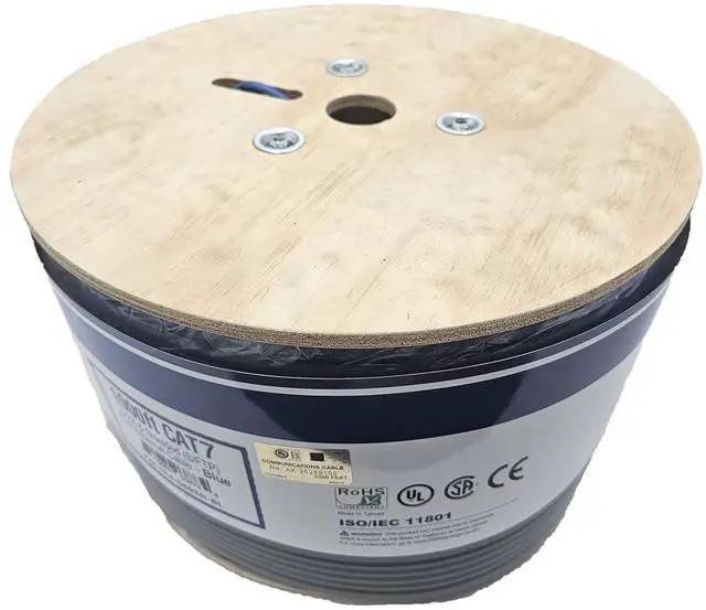 CAT7 speeds up to 10Gbps and 600 MHz bandwidth to future proof your installation 23 AWG individual solid pure copper conductors Supports Power over Ethernet: PoE, PoE+, and PoE++ Comes on a convenient wooden spool for easy access