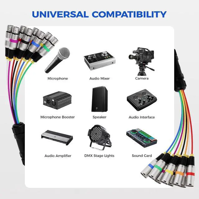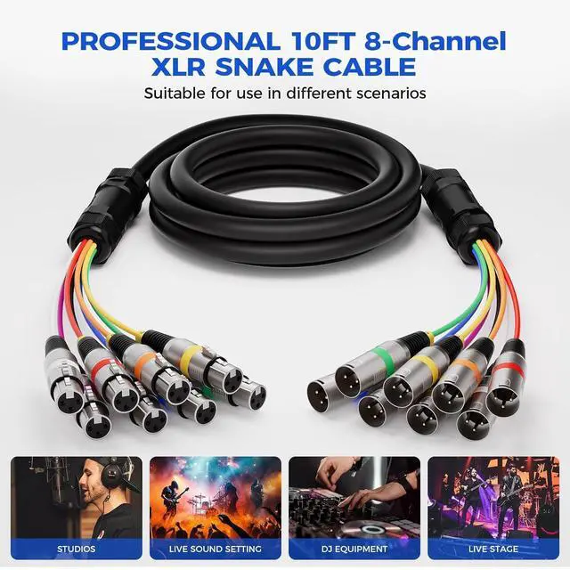 WIDELY USED, MORE APPLICATION This 8 channel xlr snake c are widely used in snake system stage boxes, studio, recording and live, especially ideal for 3-Pin XLR connector professional audios such as DJ equipment, microphones, studio monitor, mixing consoles and so on