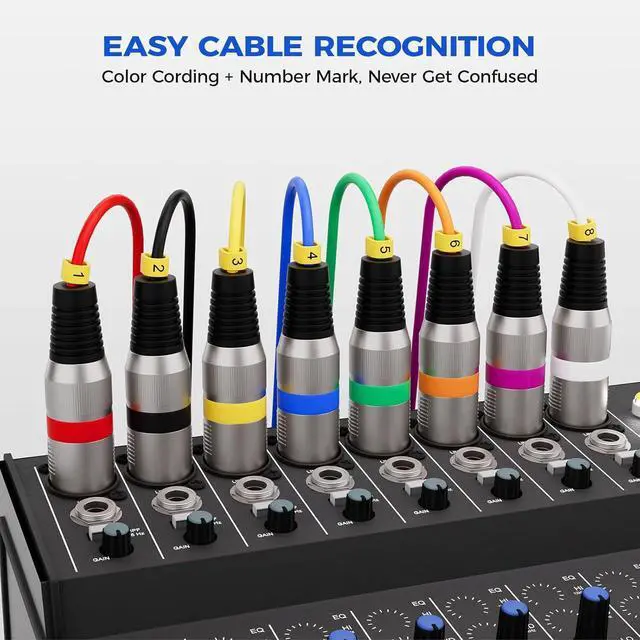 COLOR CORDING, NR GET CONFUSED This 8 channel xlr snake have 8 colorful connectors with 8 number mark, so you can identify or match microphones, mixing boards and jumper holders frames easily, nr get confused. And the unique numberical sts can make you DIY the number mark