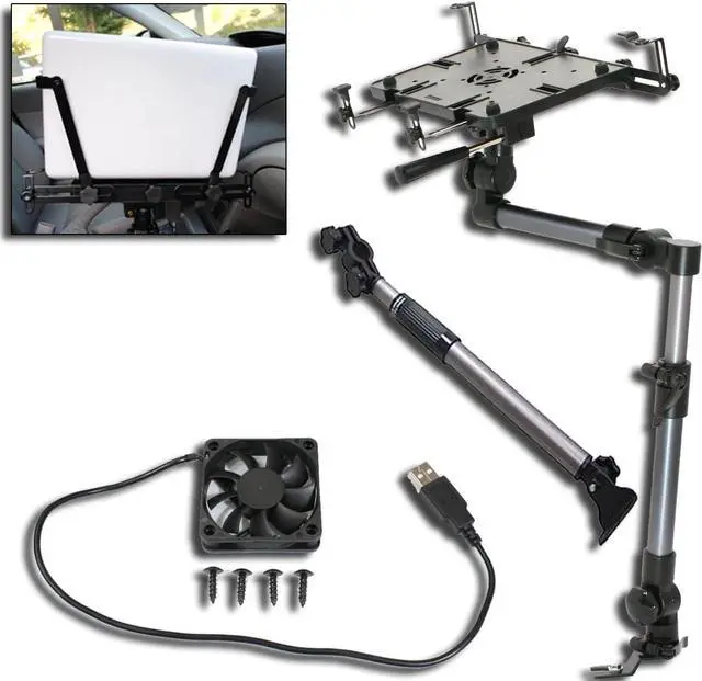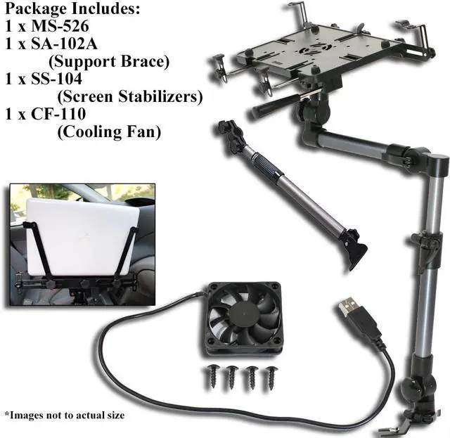 Accessories Bundle: Save money with this accessories bundle which includes 1 - support brace to increase the mounts stiffness, 1 - pair of screen stabilizers to hold the screen in place, and 1 - USB powered cooling fan preinstalled in the laptop mounting deck.