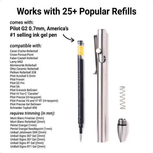 Broad Ink Refill Compatibility. Standard size pens come with the G2 0.7 mm refill, which is America's #1 selling ink for gel pens. If you're interested in trying new refills, you can pick from dozens of refills across the most popular brands. Customers especially love the flexibility to use different refill types in picular colors.